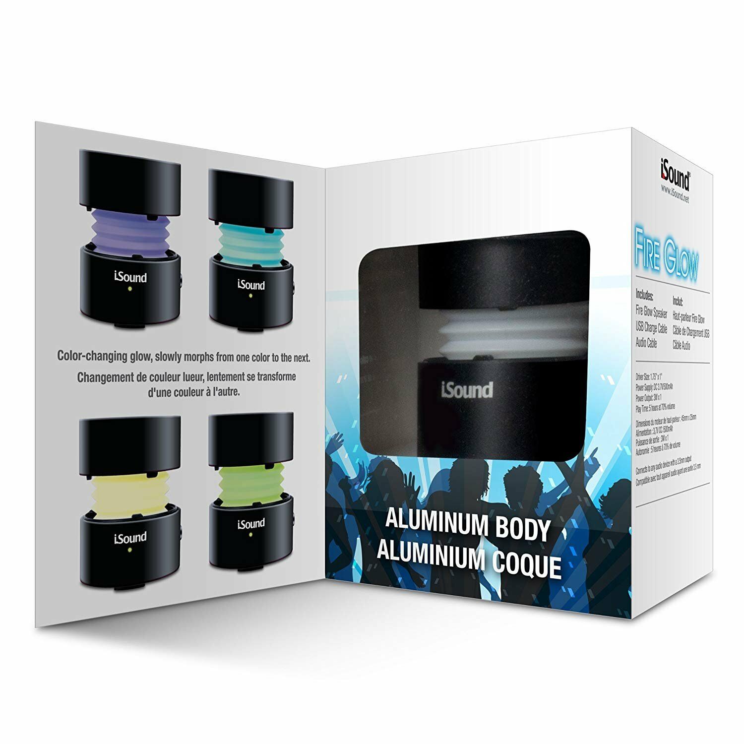 The Fire Glow Speaker will surprise you with its crystal clear sound and powerful bass. Its compact aluminum casing design is both durable and extremely portable, plus, it's expandable for improved sound quality! The Fire Glow plays iPod, iPhone and iPad devices, smartphones, notebook computers, MP3 players or other audio device via 3.5mm aux input and is powered by a Li-Poly battery with 5 hours of playtime at 70 percent volume. Includes a USB cable for quick charging.